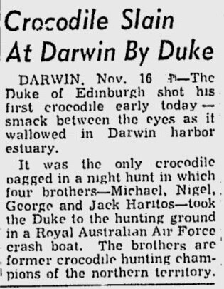 He was here again as soon as 1956, arriving for the first time by air, to open the Olympic Games in Melbourne. He also shot a crocodile (not at the Games) and inspected the uranium processing plant at Rum Jungle.