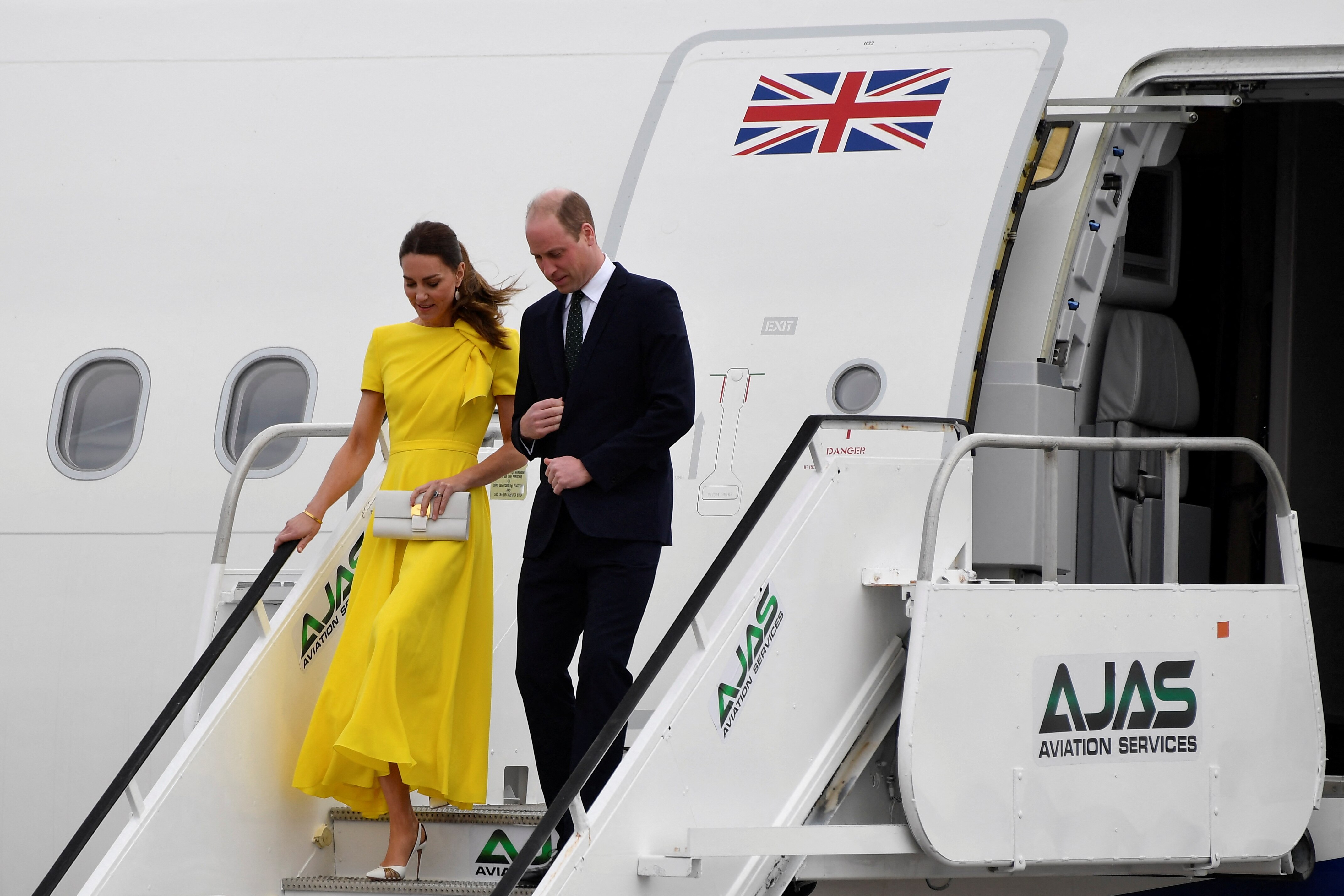 The Duke and Duchess stepped off the plane at Kingston's Norman Manley airport on Tuesday (local time) to Jamaica's military band.