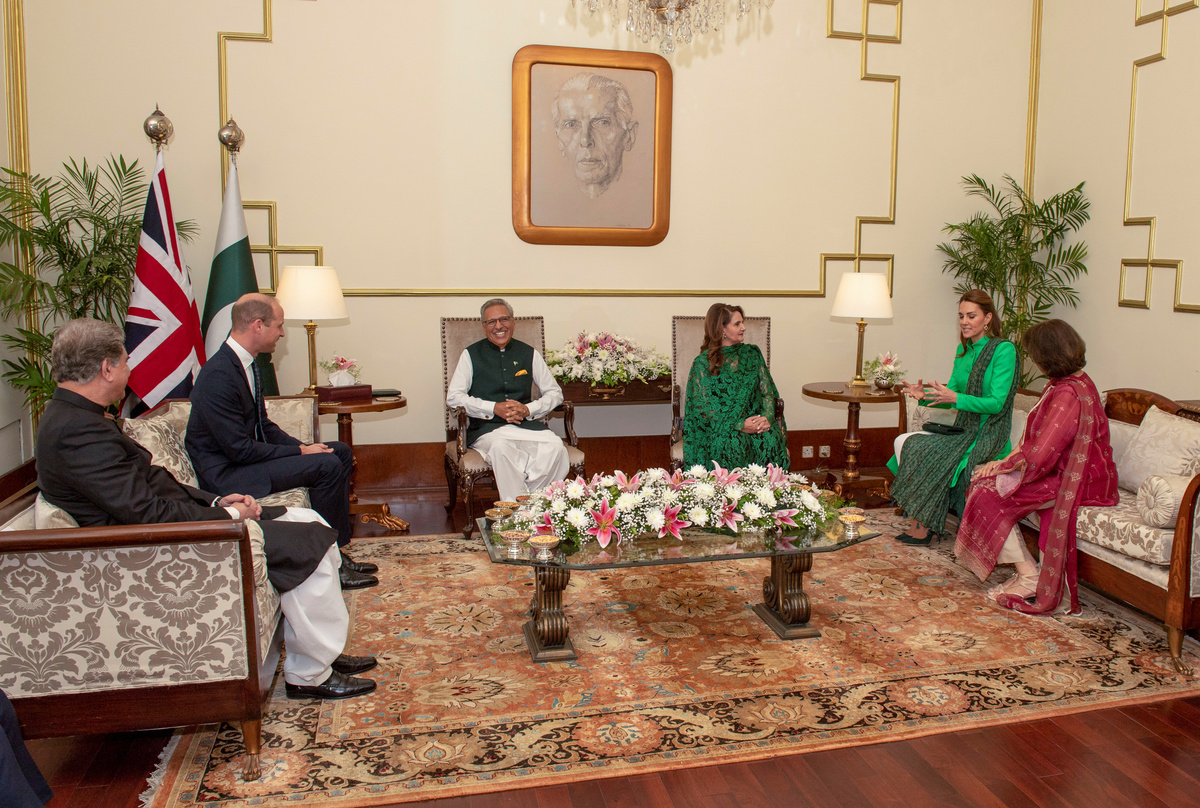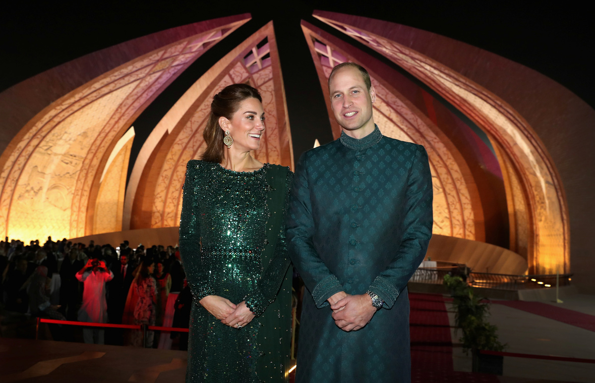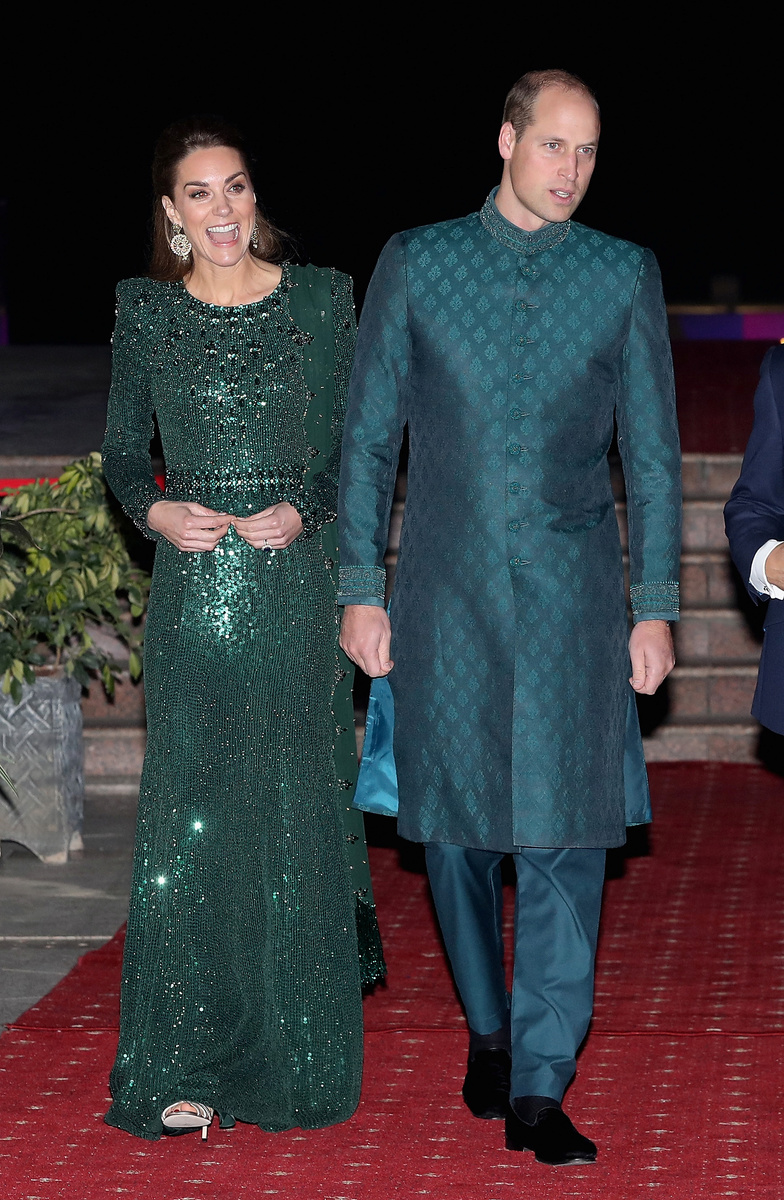The Duke and Duchess of Cambridge arrived at the hilltop monument in a rickshaw painted with the Pakistani and UK flags. Prince William wore a teal sherwani suit, a long dresscoat worn over trousers, while the Duchess of Cambridge wore a dress by British designer Jenny Packham in deep green, the color of Pakistan's flag.