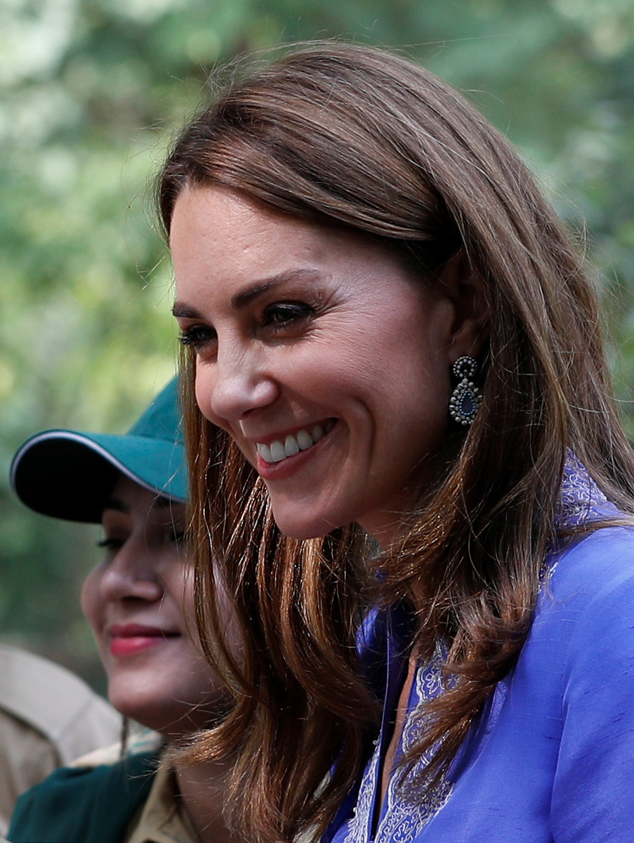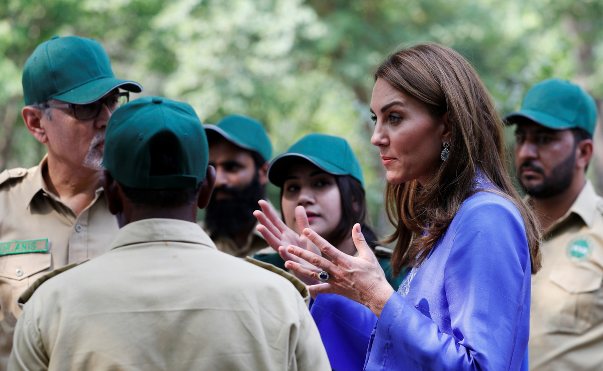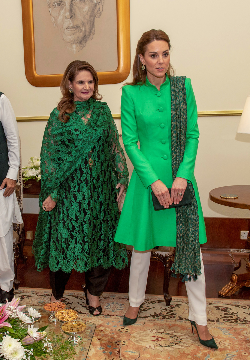 For the morning events, Kate wore a periwinkle blue silk shalwar kameez, the national outfit of Pakistan consisting of a loose tunic worn over trousers. Many on social media and in the fashion industry had been hoping she would don the outfit, which Princess Diana had worn during visits.