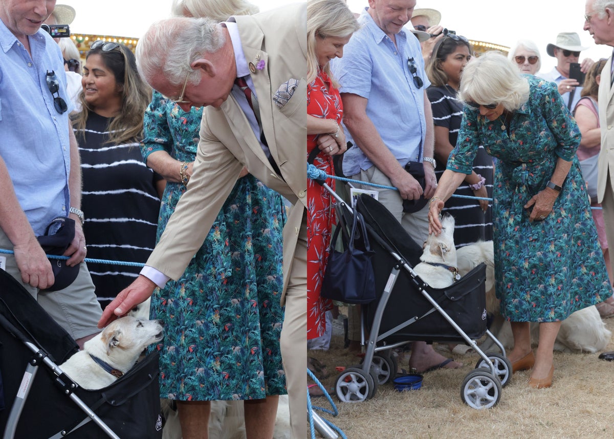 The Prince of Wales and Duchess of Cornwall have been captured admiring a dog in a pram at the Sandringham Flower Show.