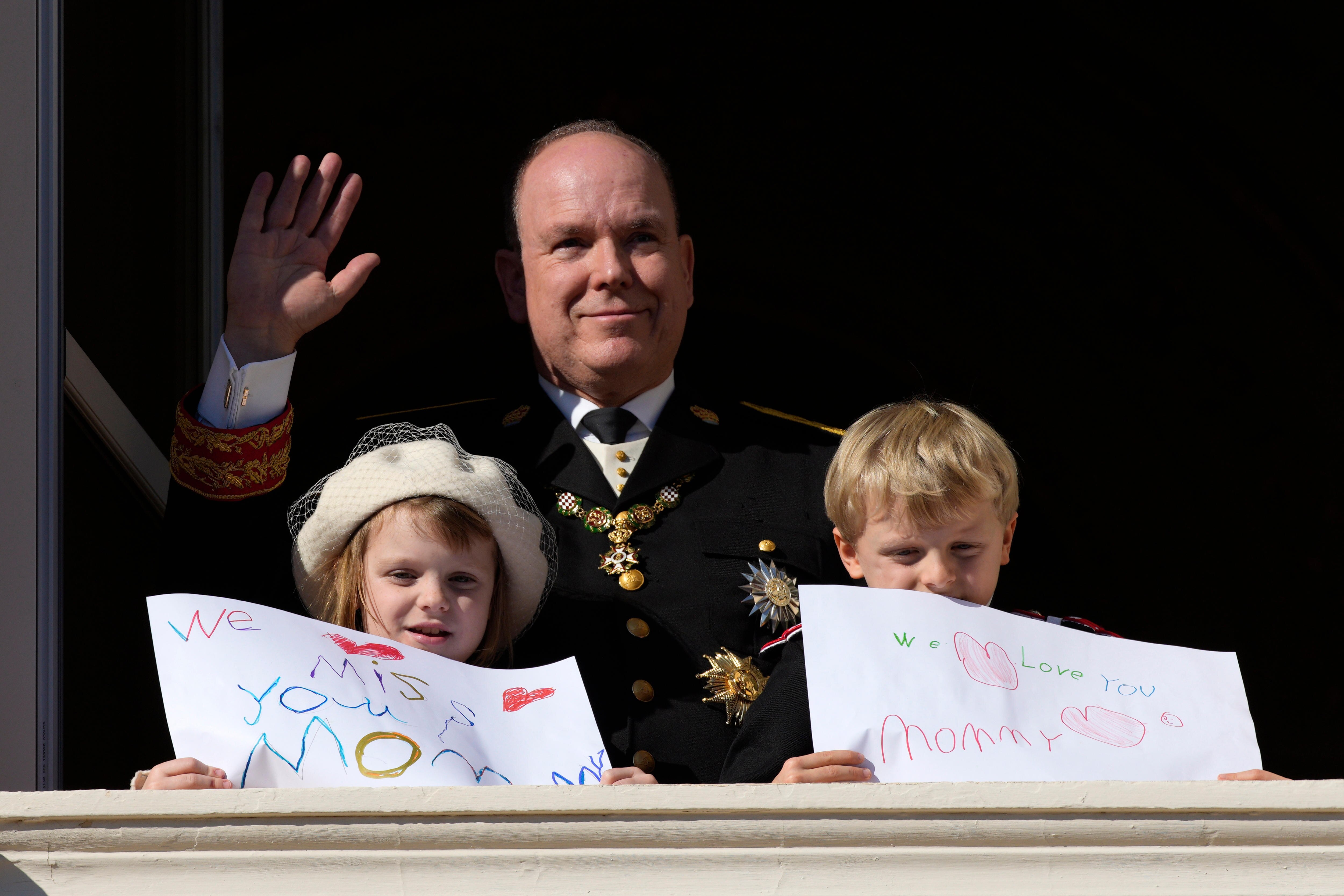 Prince Albert and Princess Charlene's six-year-old twins, Princess Gabriella and Hereditary Prince Jacques are holding handmade signs saying, "We miss you Mommy" and "Love you Mommy".