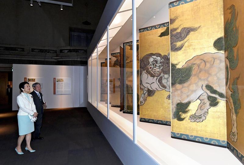 Princess Hisako looked carefully at the byobu folding screens titled "Chinese Lions," the right screen of which was painted by Kano Eitoku and the left screen of which was painted by his great-grandchild, Tsunenobu. "The brushwork is totally different," she said.