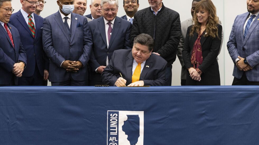 The celebration with union leaders included several references, veiled or explicit, to former Gov. Bruce Rauner, who tried to roll back union power by encouraging right-to-work laws. Right-to-work refers to allowing people to skip paying union dues as a condition of employment.