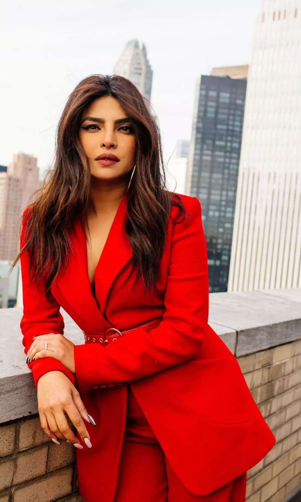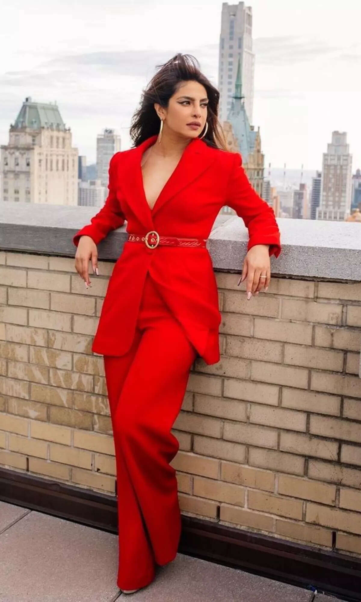 Priyanka Chopra Jonas slayed in this red pantsuit which was cinched around the waist with a belt.