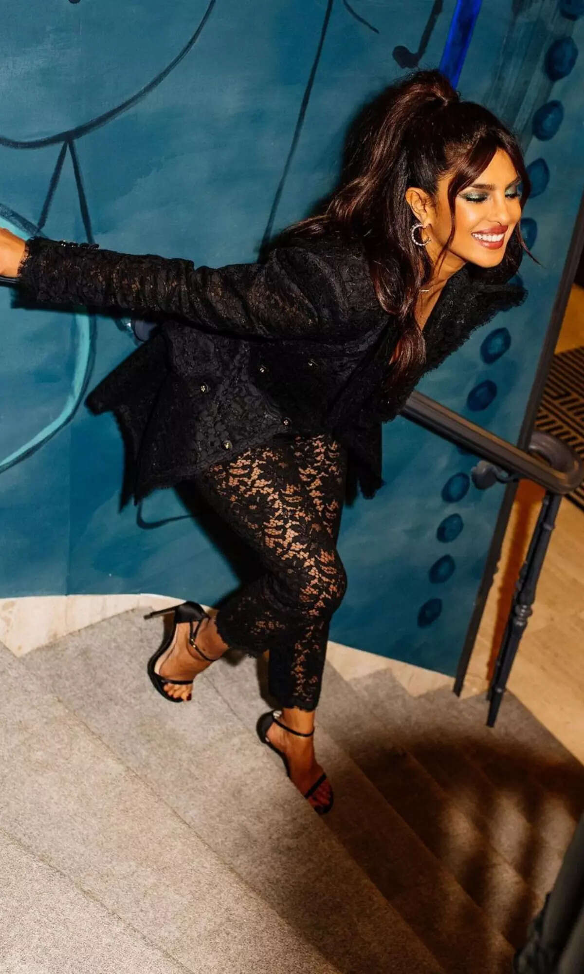 She is a fan of lace and keeping the holiday season in mind, she rocked this lace catsuit from Dolce & Gabbana and layered it with a blazer.