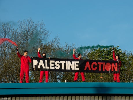 Images showed protesters on the roof spraying flares and holding a banner with their group name “Palestine Action”.