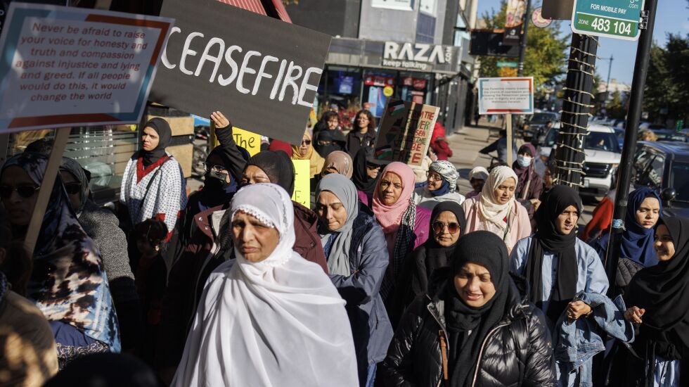 Dozens of Palestinian supporters marched through West Ridge on the North Side Sunday calling for a cease-fire in the Israel-Hamas war to save civilian lives in Gaza.