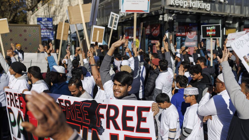 The war, now in its 16th day, started after the surprise Hamas attack on a series of Israeli communities on Oct. 7. The protest on Sunday comes as Israeli forces are on the verge of launching a ground offensive in Gaza.