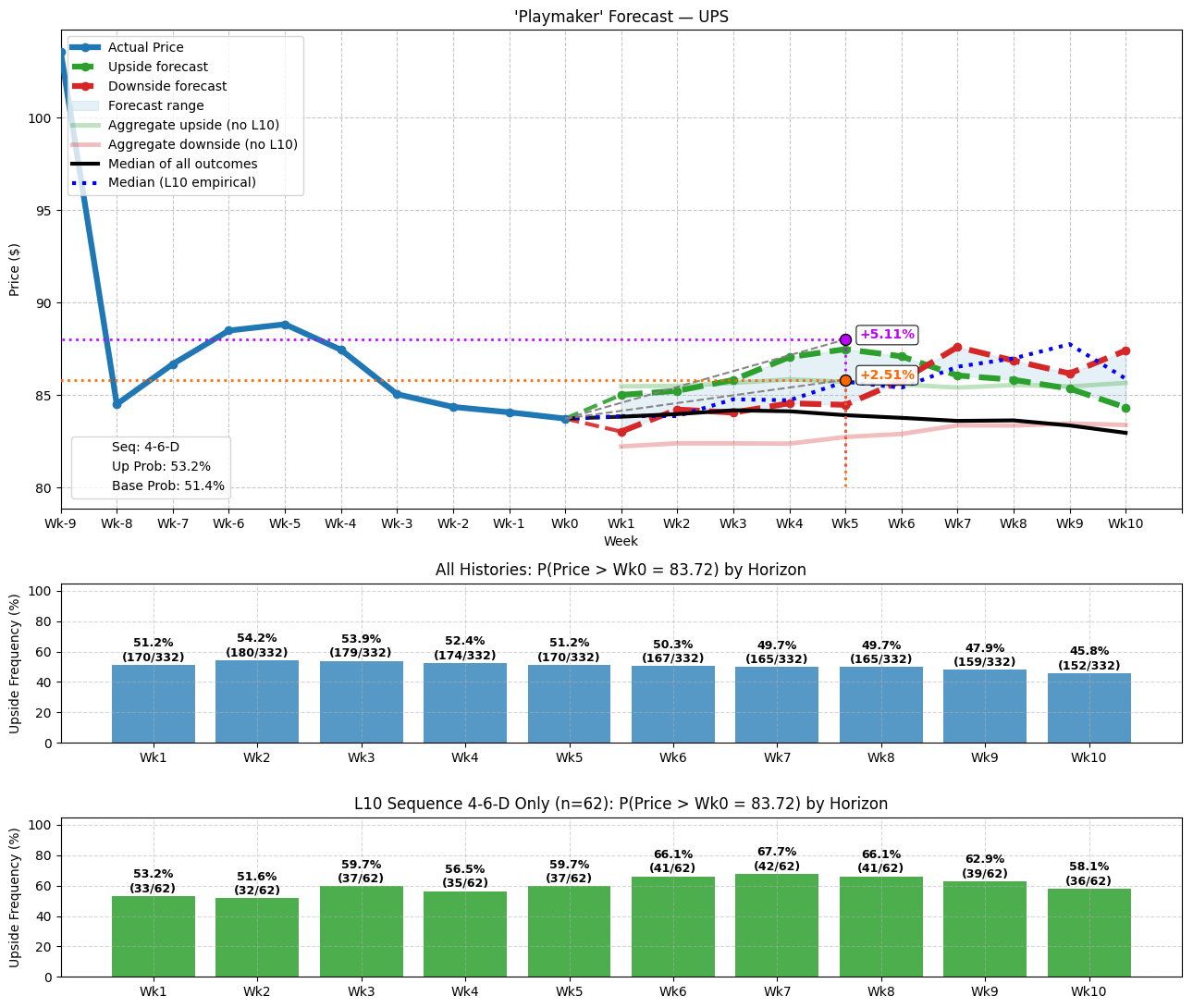 In the trailing 10 weeks, UPS stock has printed a 4-6-D sequence: four up weeks, six down weeks, with an overall negative trajectory. Since January 2019, this particular sequence has materialized 62 times on a rolling basis. Notably, in the fifth week following the sequence, UPS finds itself above the anchor price (i.e. Friday’s close of $83.72) 37 out of 62 times or nearly 60%.