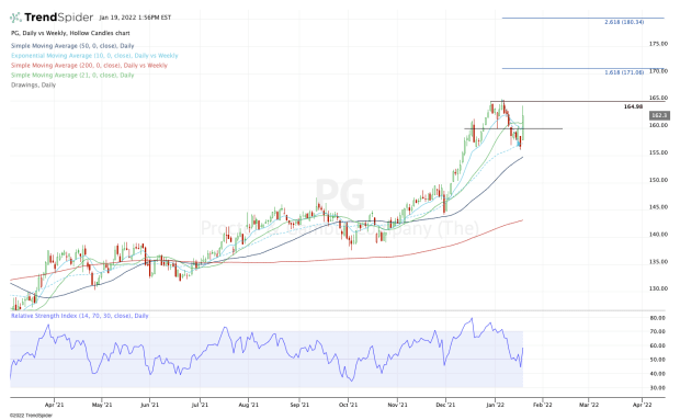 Not only has this level proved notable -- as both resistance and support -- over the past few weeks, but a break below this mark puts P&G stock back below the 10-day and 21-day moving averages.