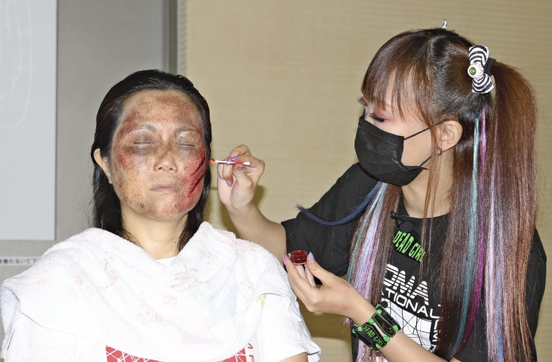 OSAKA -- With Halloween on the way, aspiring zombies were offered tips for gruesome makeup and terrifying acting in the "Program to Train Zombies" at the Gallery Yomiuri in Kita Ward, Osaka City.
