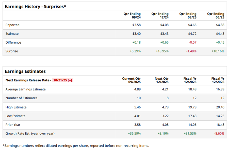 The Progressive Corporation (PGR), headquartered in Mayfield Village, Ohio, operates as an insurance holding company. Valued at $144.5 billion by market cap, provides personal and commercial auto, personal residential and commercial property, business-related general liability, and other specialty property-casualty insurance products and related services. The leading property & casualty insurance company is expected to announce its fiscal third-quarter earnings for 2025 on Tuesday, Oct. 21.