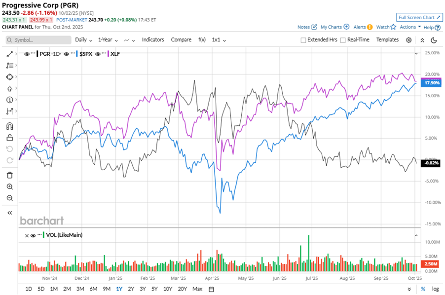 PGR stock has underperformed the S&P 500 Index’s ($SPX) 17.6% gains over the past 52 weeks, with shares down 4.3% during this period. Similarly, it underperformed the Financial Select Sector SPDR Fund’s (XLF) 18.2% gains over the same time frame.