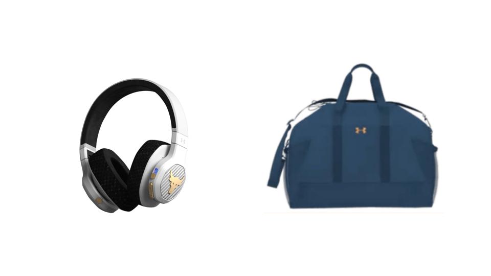There’s also a new Onyx White/Metallic Gold version of the Project Rock over-ear headphones in the collection and a gym bag with a water-repellent finish.
