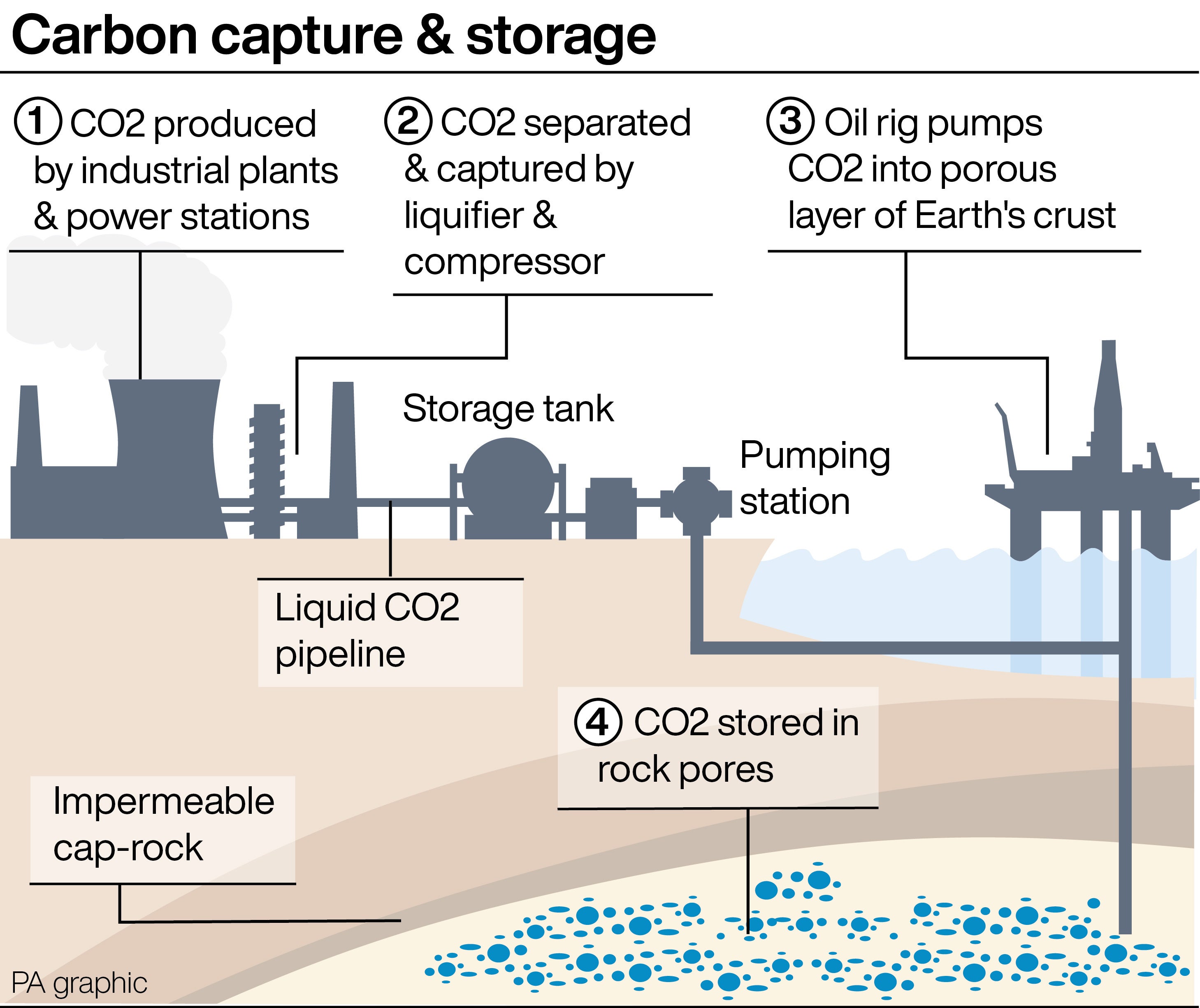 Technology to capture carbon dioxide and pipe it to long-term storage deep underground or under the sea is seen as important in tackling emissions from industrial processes, hydrogen production and gas power plants.
