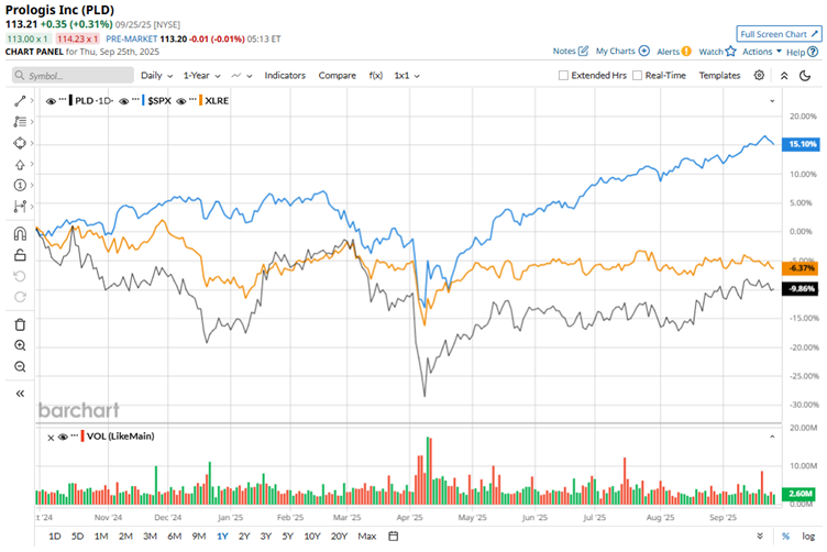 Over the past year, Prologis has seen its stock dip 9.7%, underperforming the broader S&P 500 Index ($SPX), which surged 15.4% over the same period. Even compared with its real estate peers, PLD underperformed, as the Real Estate Select Sector SPDR Fund (XLRE) dipped a more modest 7.2%, underscoring the stock’s relative weakness in a mixed market environment.