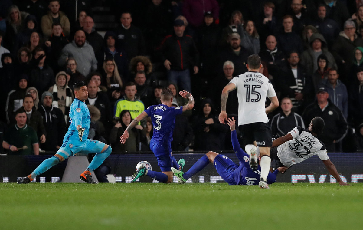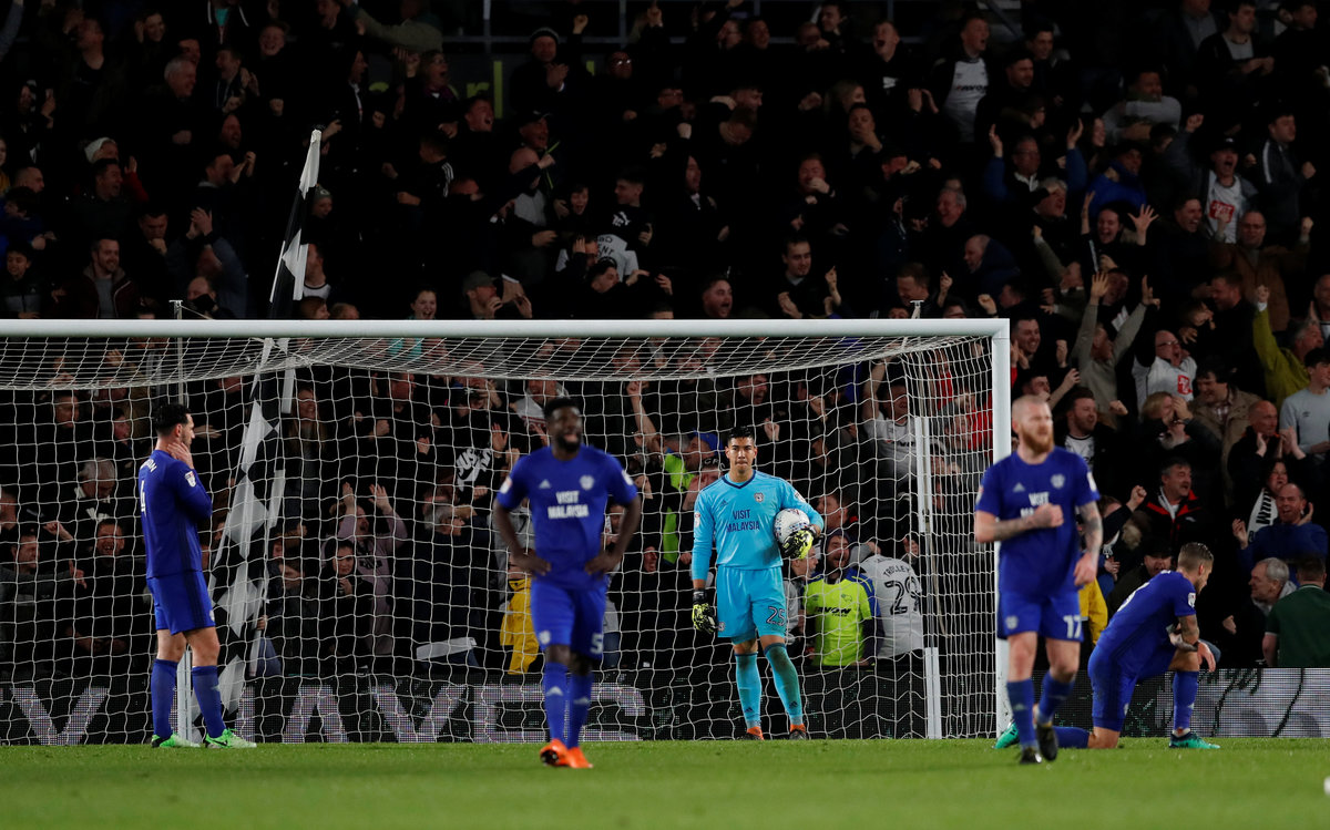 (Reuters) - Cardiff City's hopes of gaining automatic promotion to the Premier League were dealt a blow with a 3-1 defeat at Championship playoff contenders Derby County on Tuesday.