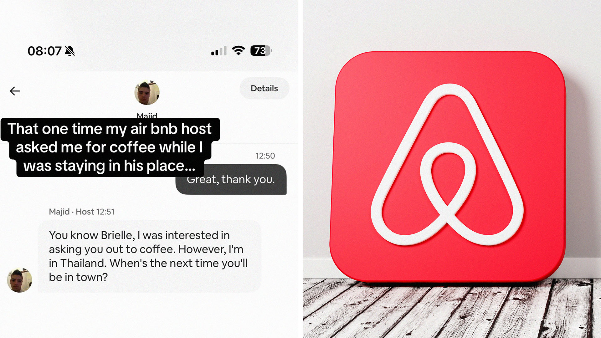 On-screen text reads, “That one time my Airbnb host asked me for coffee while I was staying in his place.” The caption continues, “Glad he was in Thailand. Yes, I checked for cameras.”