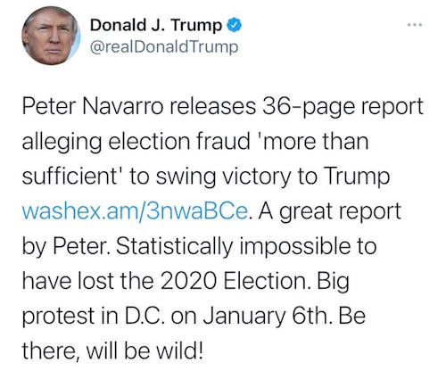 The tweet in question was fired off by Trump on Dec. 19, 2020. In it, Trump links to a report from his ally and deeply unserious person Peter Navarro that claims to reveal enough instances of voter fraud during the 2020 election to “swing victory to Trump” — which is not how anything works, but sure. (Navarro would later go on to explain how he and others in Trump’s circle actively planned to overturn the 2020 election.) “Statistically impossible to have lost the 2020 election,” Trump claims, before adding what would ultimately serve as the rallying cry for insurrectionists: “Big protest in D.C. on January 6th. Be there, will be wild!”