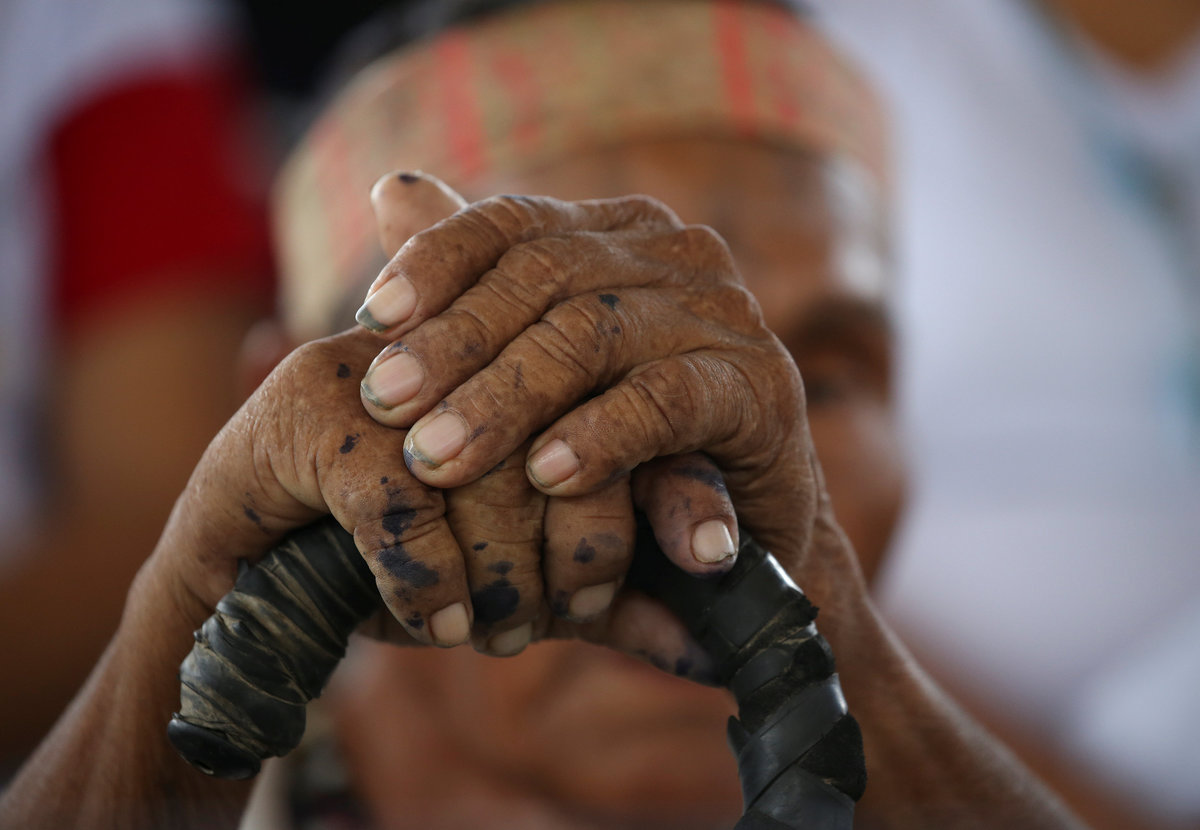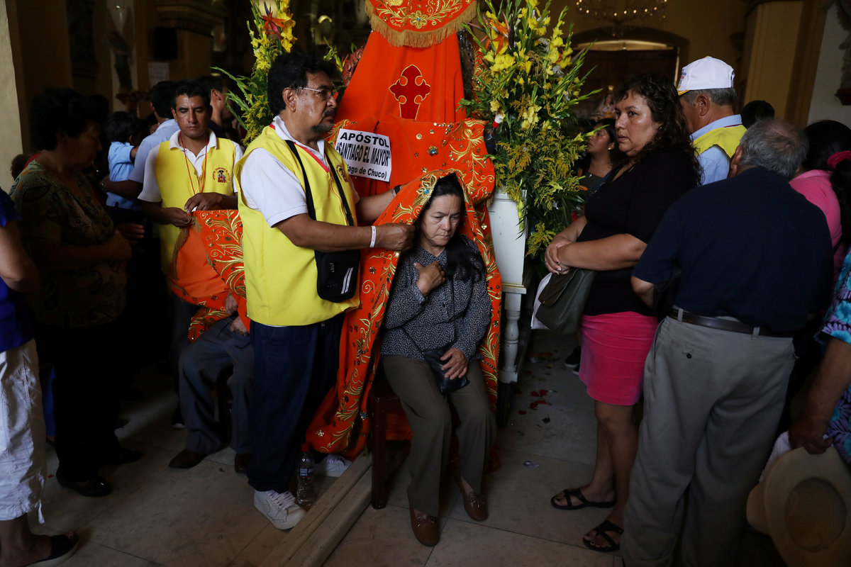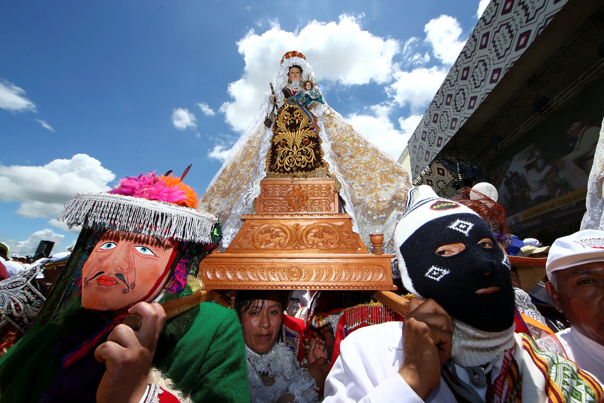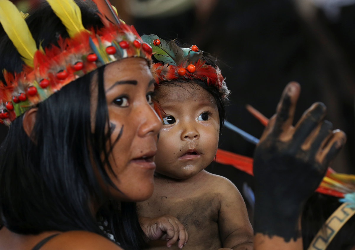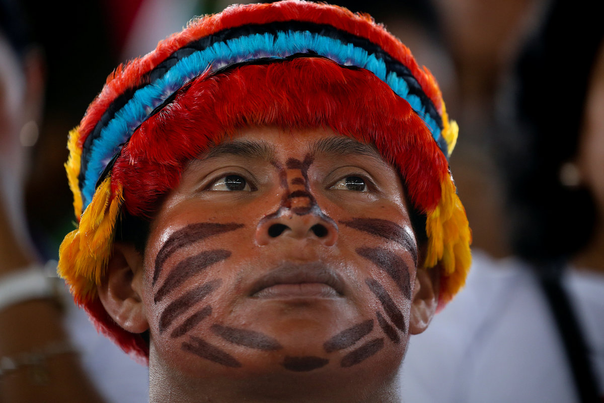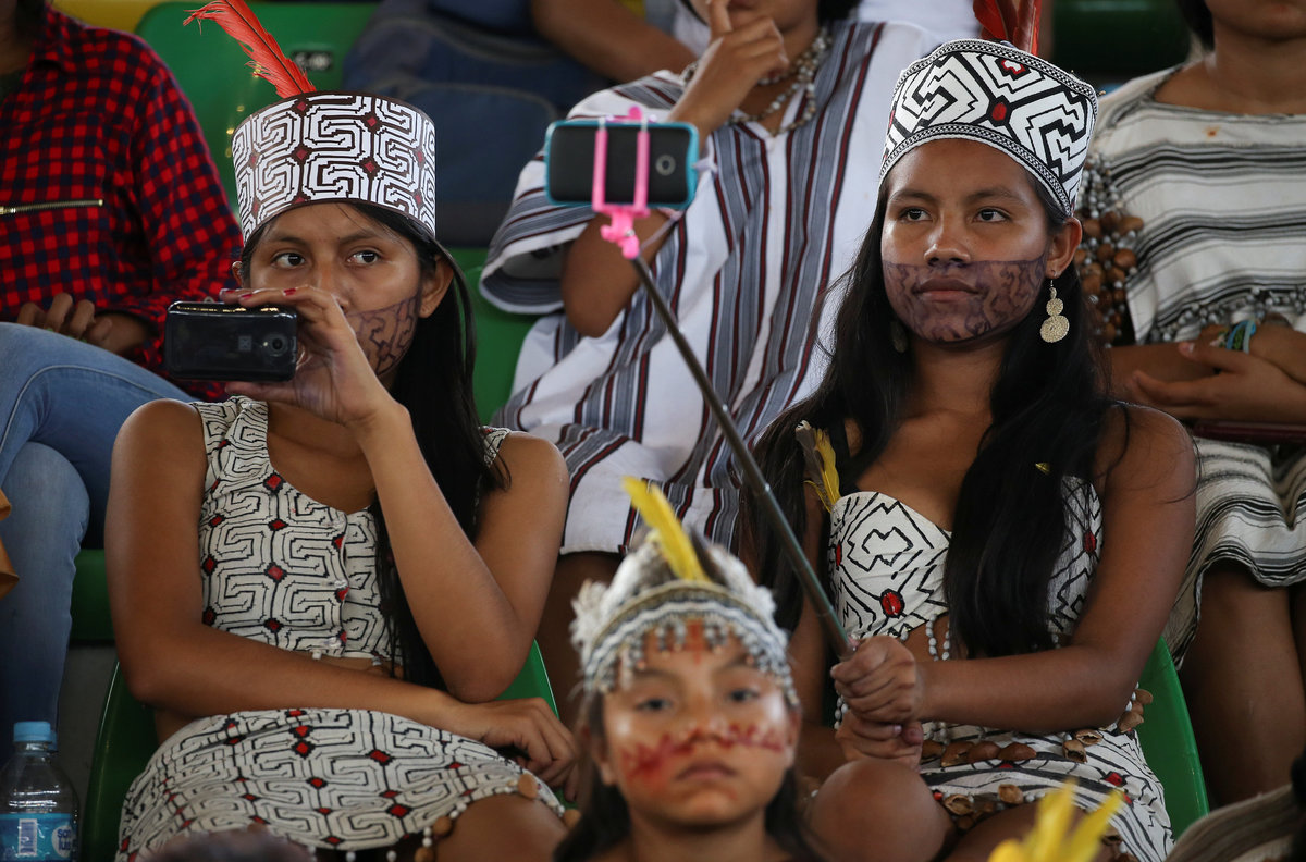 Thousands of representative of the groups from across Peru walked before him, dressed in traditional regional costumes and feather headdresses and speaking in their native languages, as traditional wind instruments sounded mournfully in a small stadium built to look like a hut in the city of Puerto Maldonado.