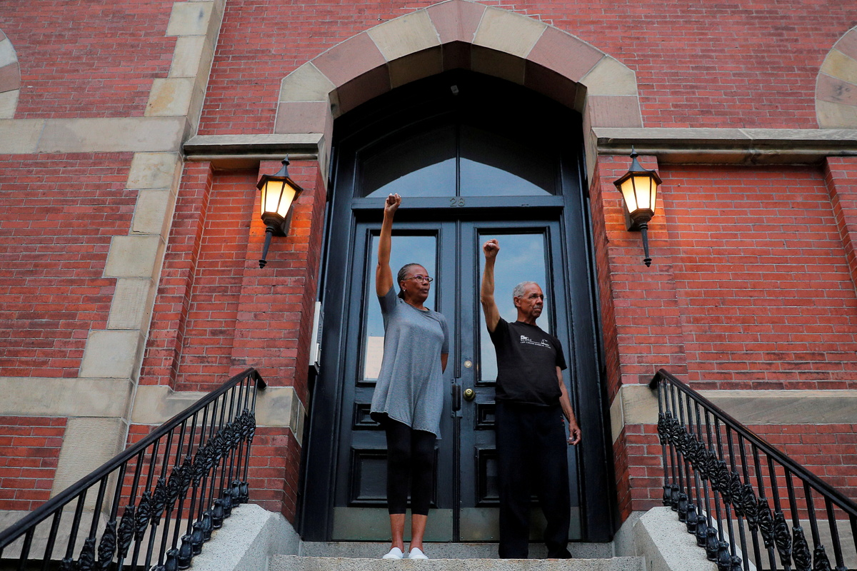 Still silent, the Freemans - self-described "children of the '60s" who are Black - simultaneously, solemnly raised their right fists. The crowd returned the salute.
