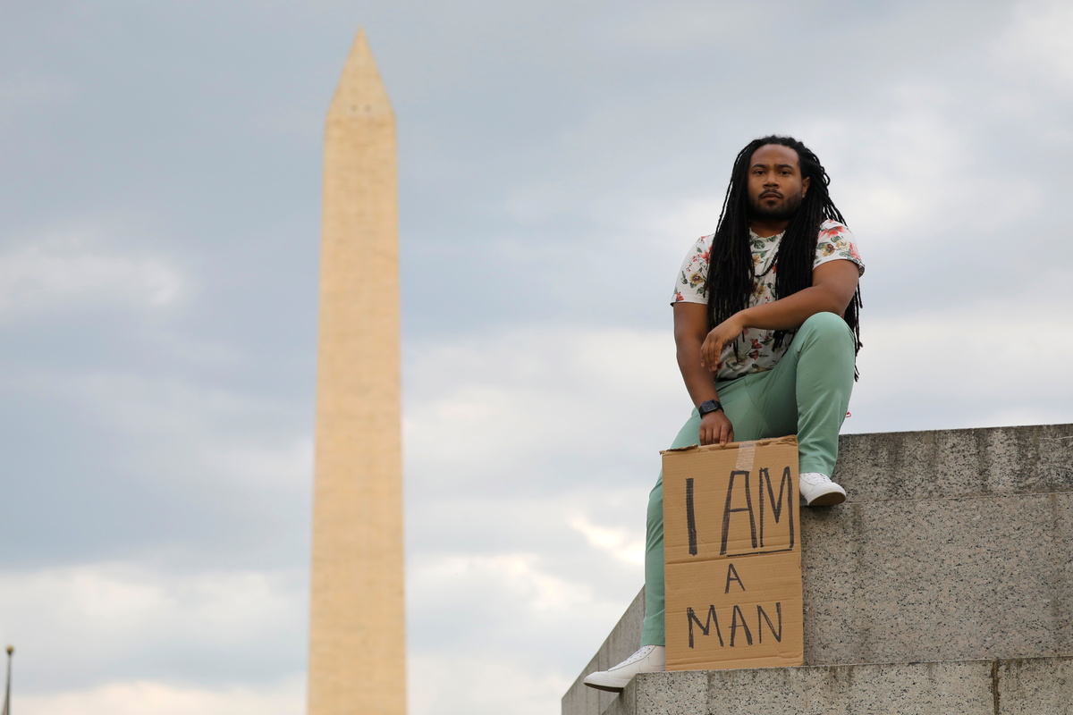 Photographer Andrew Kelly captured Wilson with a sign, the Washington Monument in the background. Wilson's sign, which he made using a cardboard box and a Sharpie, read: "I AM A MAN."