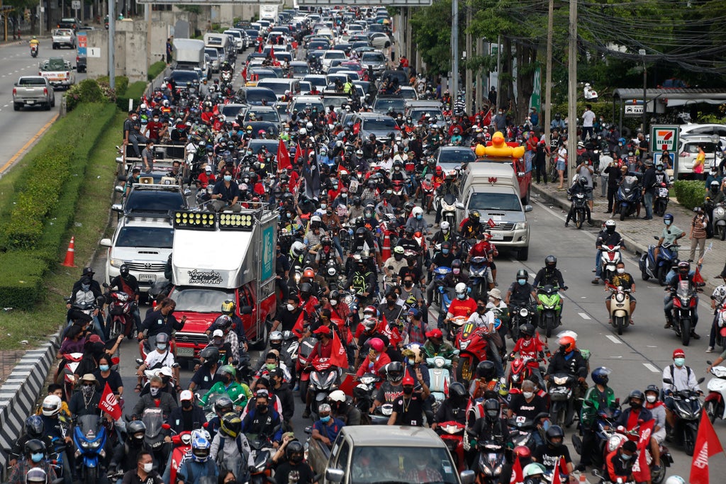 A long line of cars, trucks and motorbikes wended its way Sunday through the Thai capital Bangkok in a mobile protest against the government of Prime Minister Prayuth Chan-ocha. The protesters on wheels hope their nonviolent action, dubbed a “car mob,” can help force the ouster of Prayuth, whom they accuse of botching the campaign against the coronavirus.