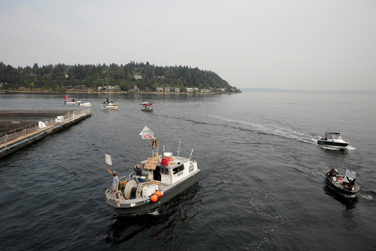 (Reuters) - Activists in Washington state plan to launch a protest flotilla on Saturday in the Pacific Ocean's Puget Sound over the accidental release of tens of thousands of farm-raised Atlantic salmon that they say threaten dwindling stocks of wild fish.
