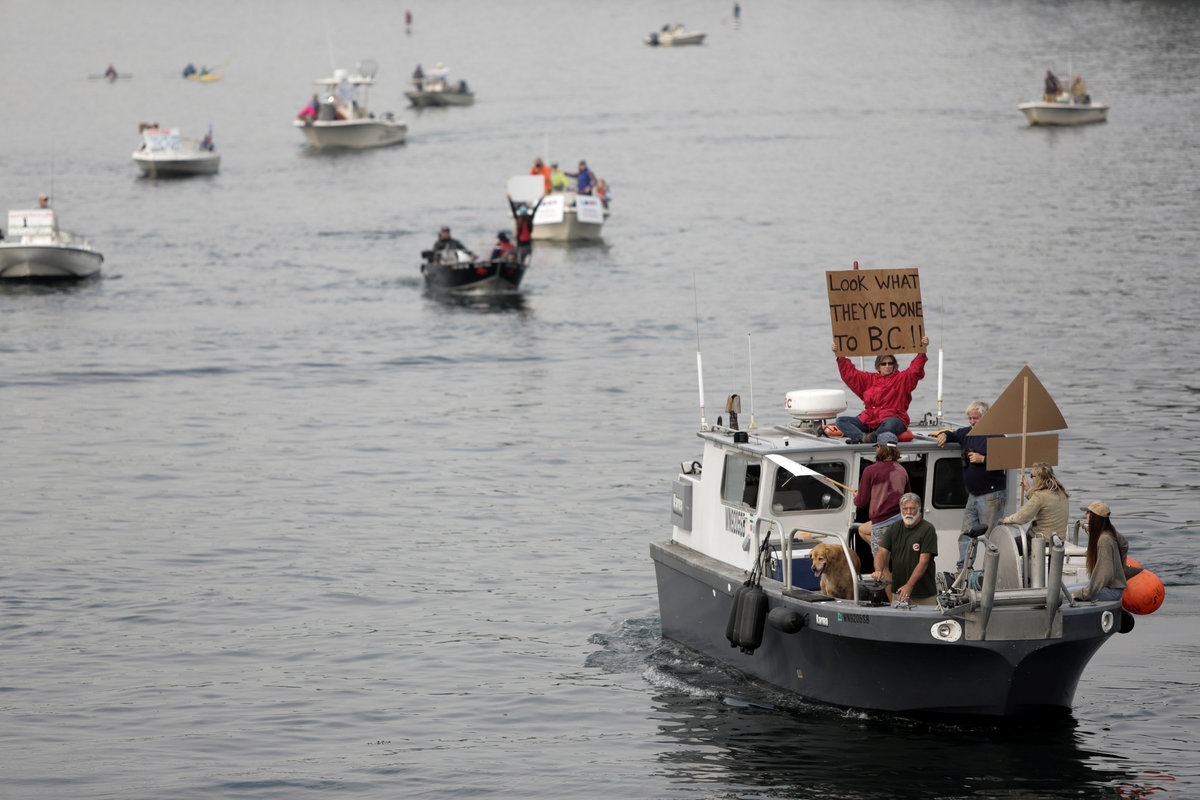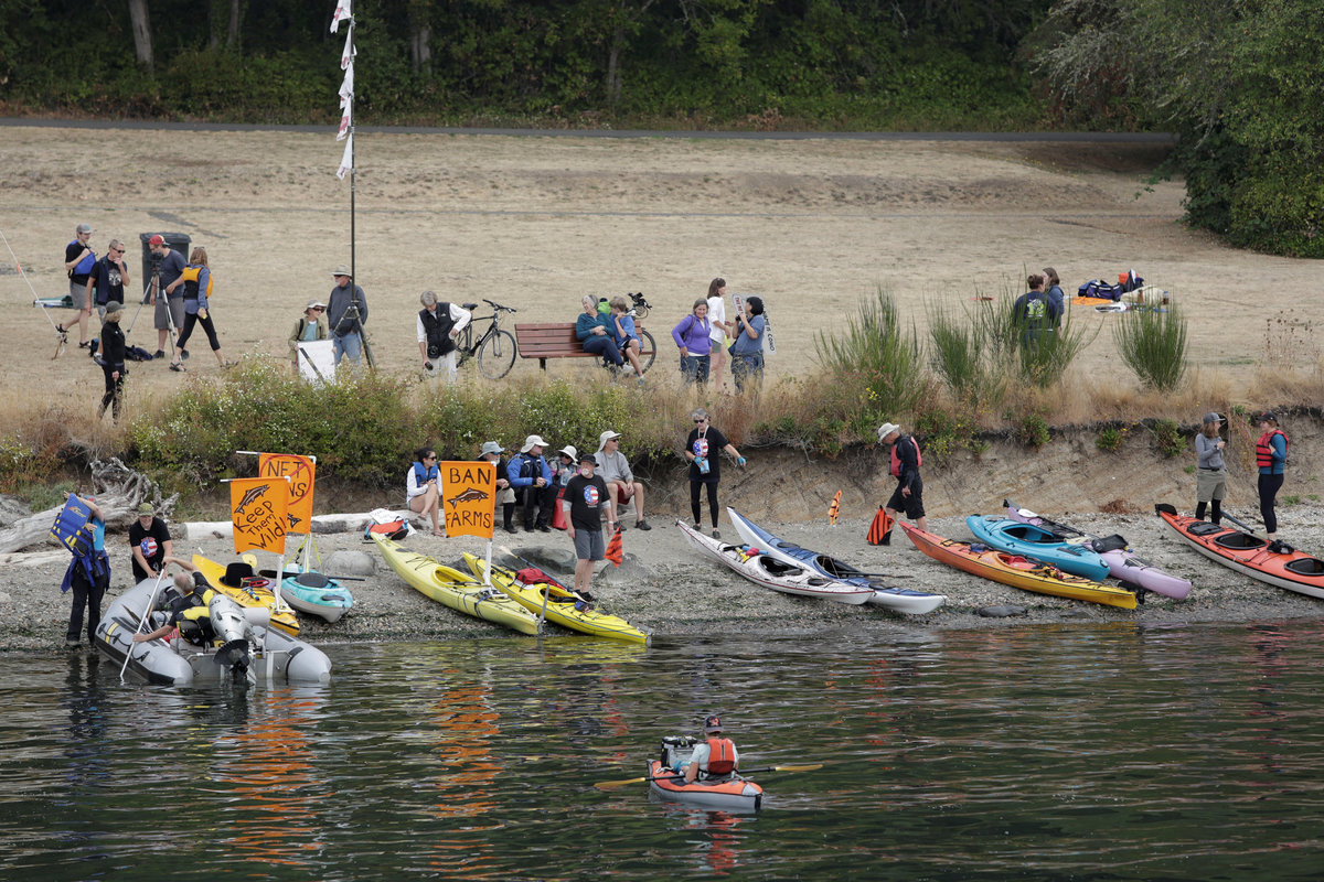 The afternoon protest, which seeks to shut down farms that raise the non-native salmon in underwater pens, is expected to draw dozens of boats, kayaks and canoes on a route along the San Juan Islands where the spill happened.