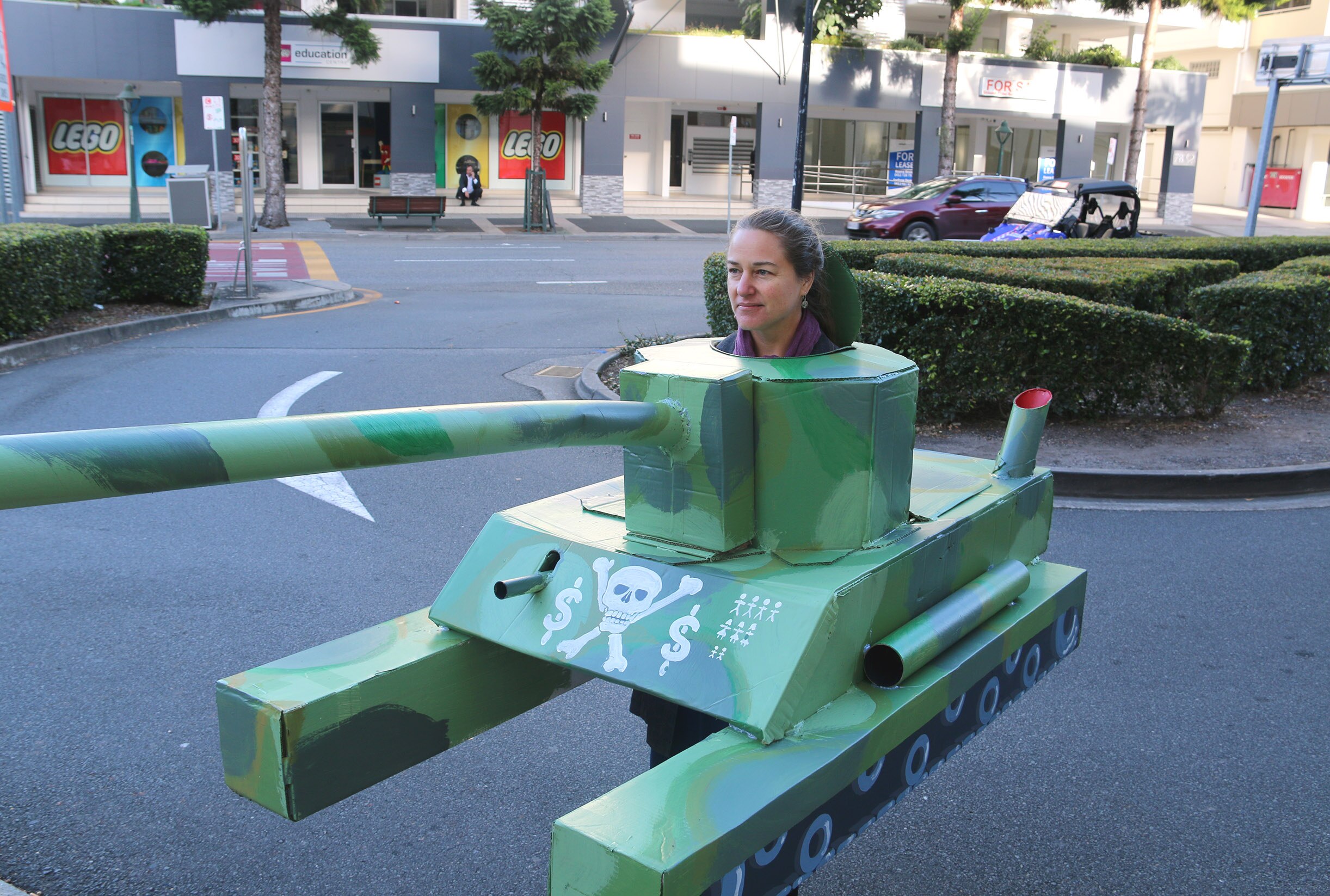 Naomi Shine came to the protest dressed as a toy tank.