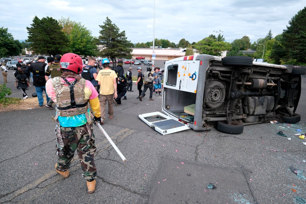 The right-wing rally drew about 100 people in a parking lot of a former Kmart store and clashes began as it wound down, KOIN-TV reported. A van tried to drive into the parking lot, but crashed and the driver ran away. Demonstrators then began igniting fireworks and similar devices. It was not immediately clear whether anyone suffered serious injuries.