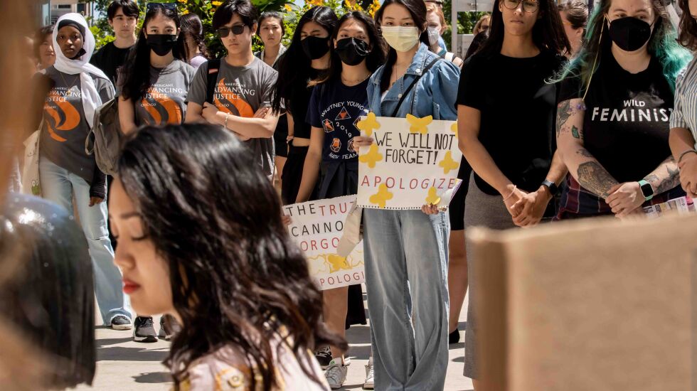 Protesters rallied in front of the Wrigley Building, 400 N. Michigan Ave., and took turns sitting with a replica of the “Statue of Peace” — or “Sonyeosang” in Korean — an artwork depicting a young woman that was installed in 2011 outside the the Embassy of Japan in Seoul, South Korea, as a monument to the women.