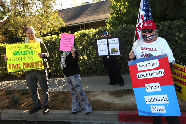 The protest outside Kuehl's home follows similar backlash against government officials as they work to stem the spread of the virus, which continues to rage unabated in the state.