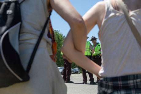 Two protesters spent the night in a boat blocking the entrance to the construction site, while one was was underneath, tucked in behind duffel bags, beach chairs, water bottles and clothing. A Hubbard County sheriff's deputy and a handful of private security guards stood by.