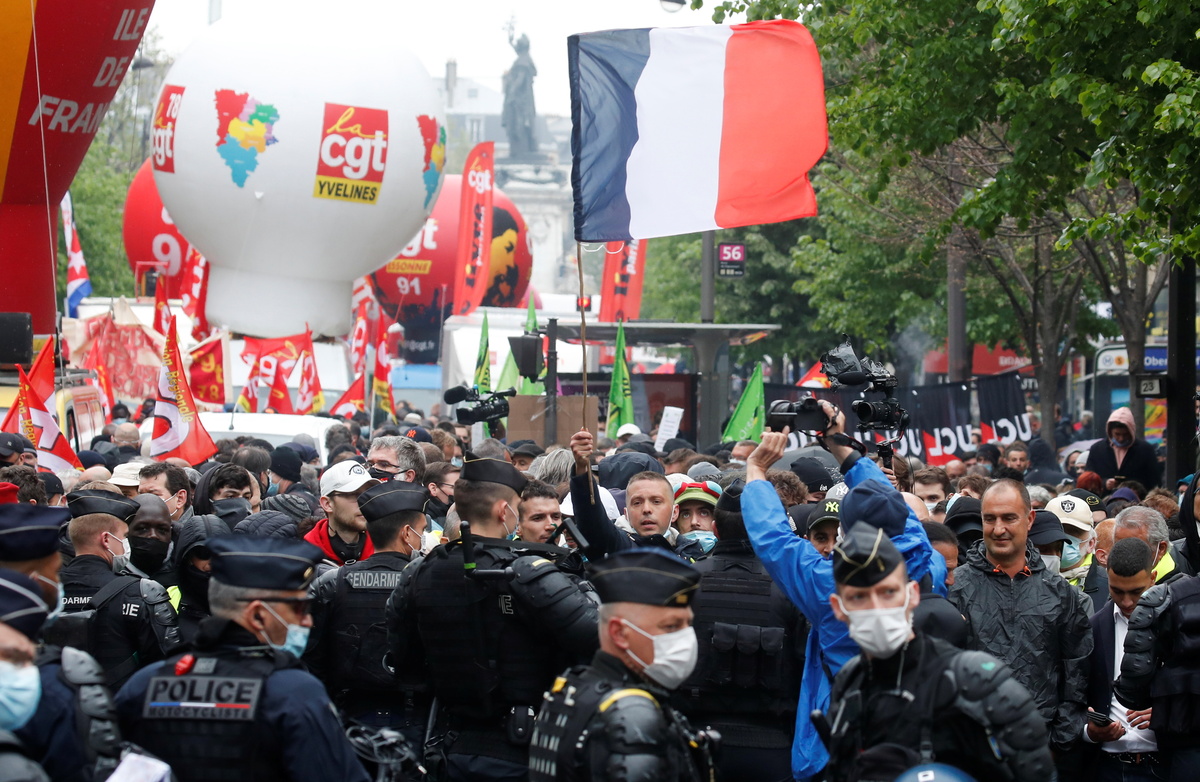 Hooded, black-clad demonstrators clashed with police in Paris on Saturday as thousands of people joined traditional May Day protests across France to demand social and economic justice and voice their opposition to government plans to change unemployment benefits.