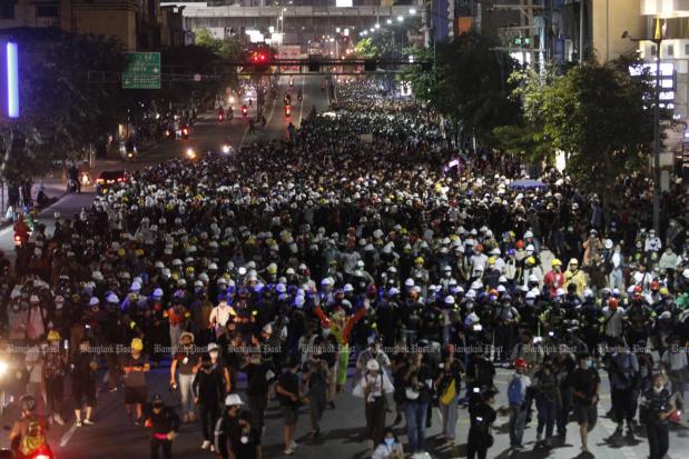 Earlier on Wednesday, anti-government protesters returned to Victory Monument to press for the ouster of Prime Minister Prayut Chan-o-cha after royalists dressed in yellow assembled in several provinces, and authorities are worried about possible clashes between the two groups in the future.
