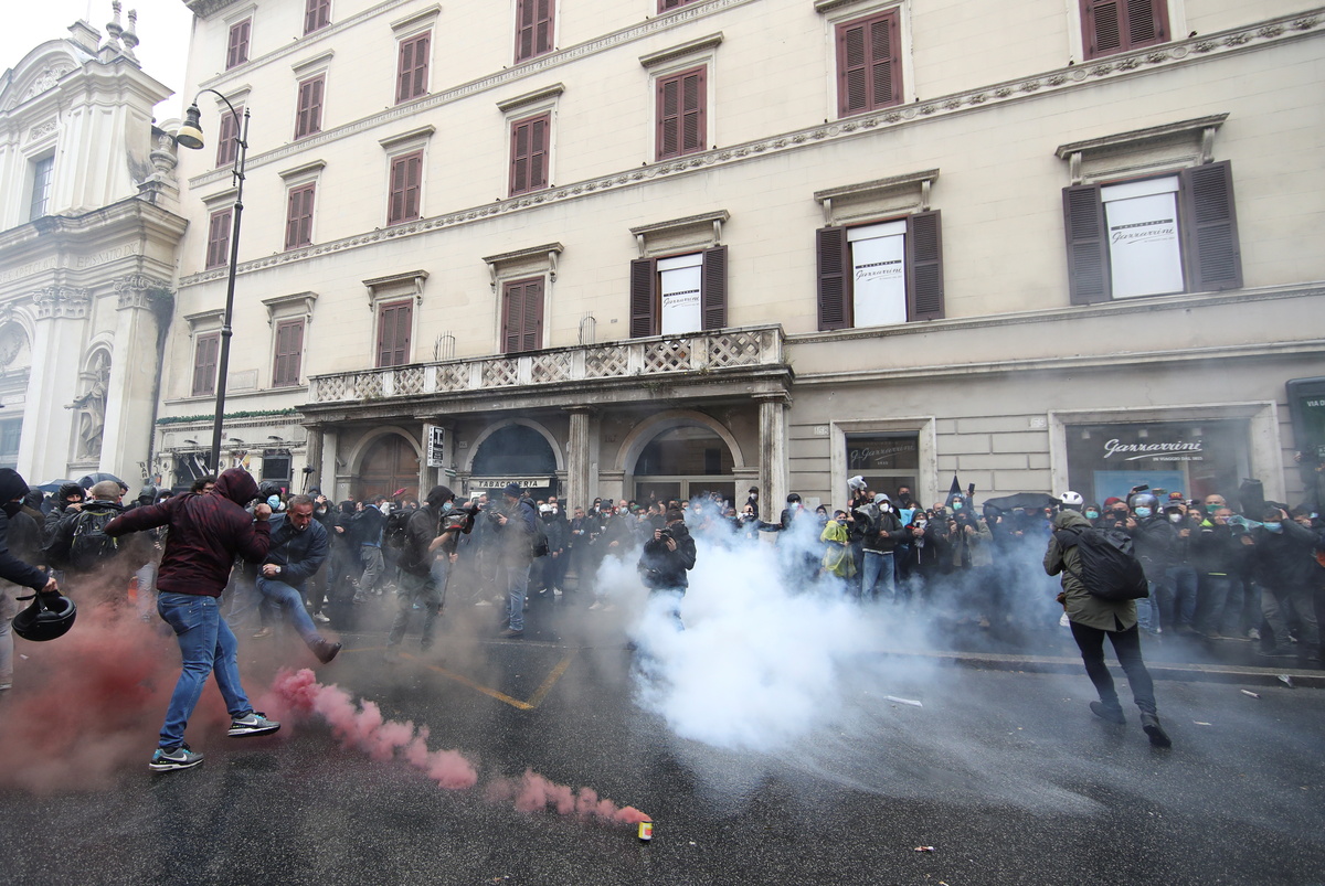 Around 200 people from all over Italy tried to reach Prime Minister Mario Draghi's office, but were held back by lines of police in full riot gear.