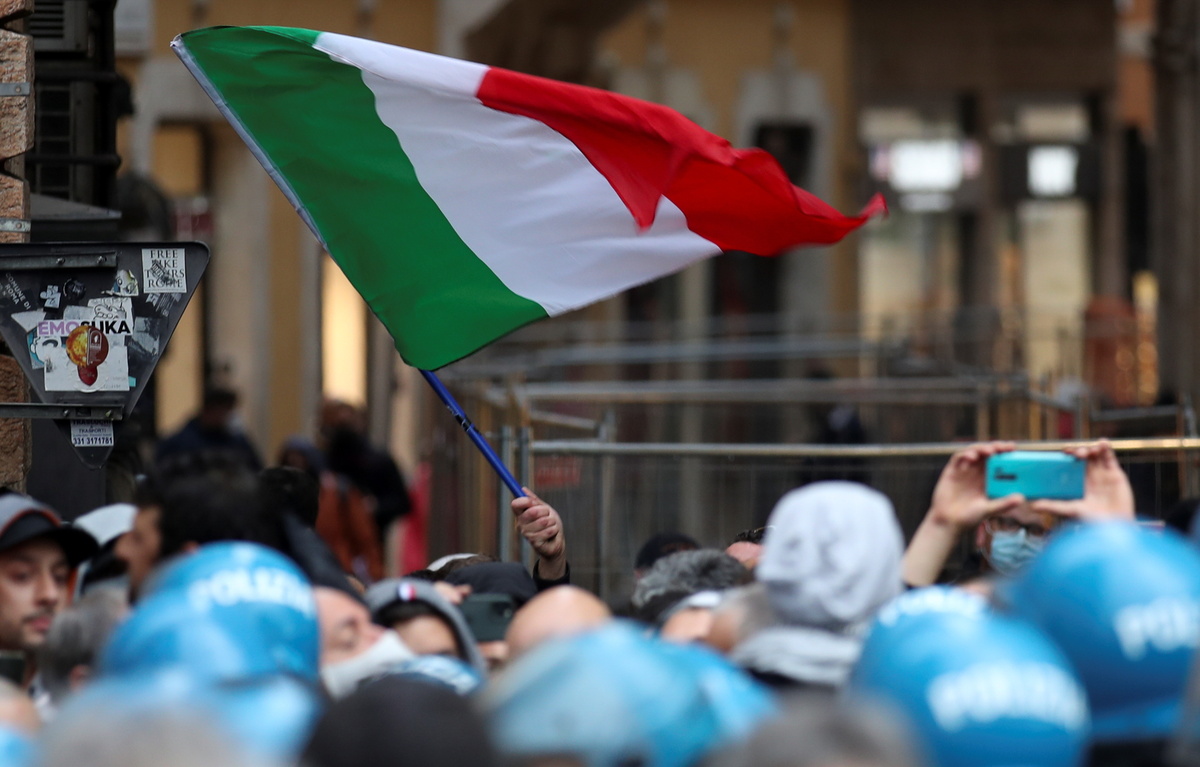 A demonstrator waves an Italian flag during a restaurant and small business owners' protest calling for their businesses to be allowed to re-open, despite no authorization for the demonstration by the government, amid the coronavirus disease (COVID-19) outbreak, in Rome, Italy, April 12, 2021. REUTERS/Yara Nardi