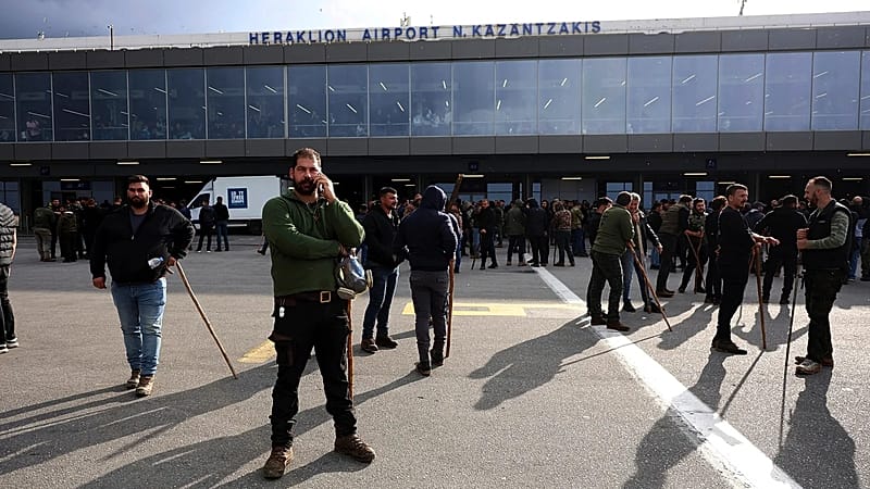 Images from local media showed dozens of farmers standing on the apron at the Nikos Kazantzakis international airport in Heraklion, the main town on Crete, forcing the airport to suspend all flights.