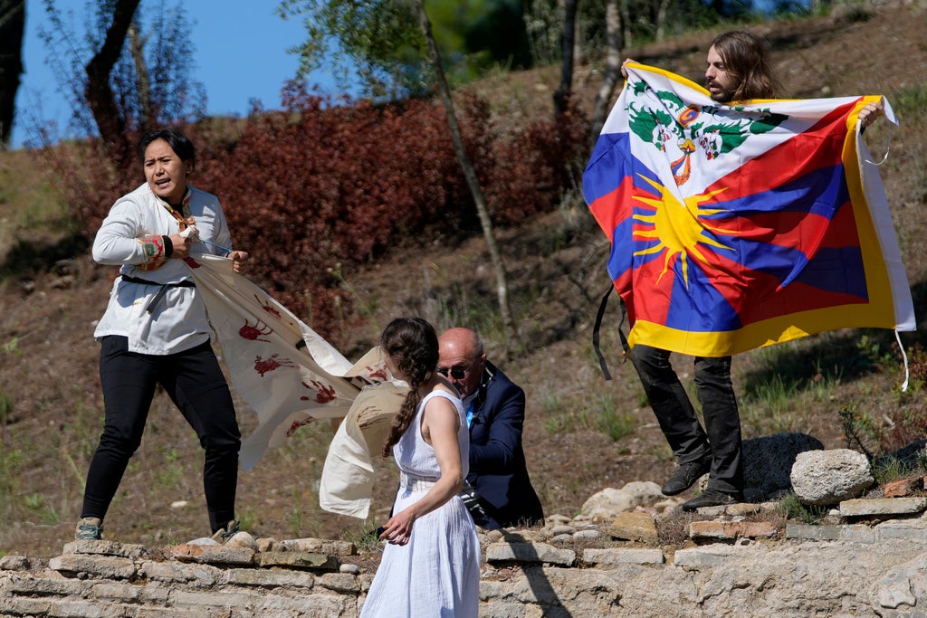 Three activists protesting human rights abuses in China broke into the archaeological site where the flame lighting ceremony for the 2022 Beijing Winter Olympics was being held Monday and ran toward the Temple of Hera holding a banner that read “No genocide games.”