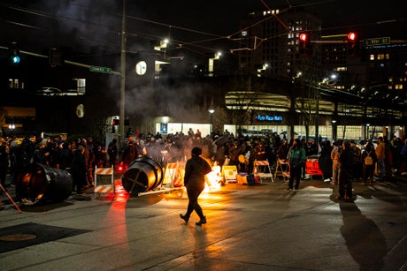 Pictures and videos appearing on social and local media showed a makeshift barricade on fire and crowds of protesters, including one holding a sign that said "CONVICT KILLER COPS", and another who appeared to be shining a laser at police at eye level.