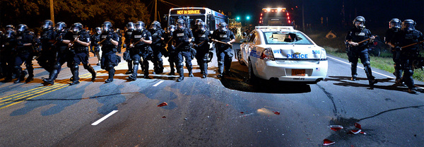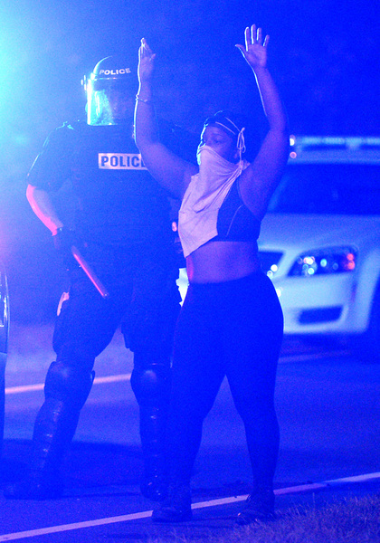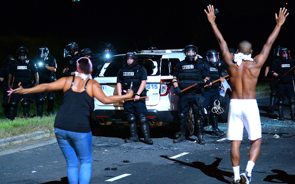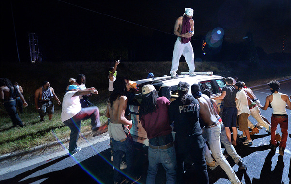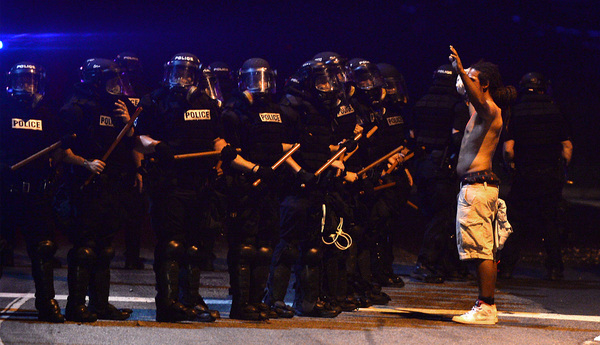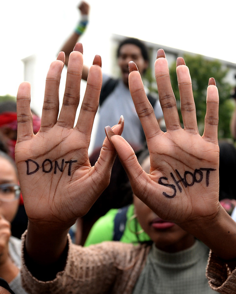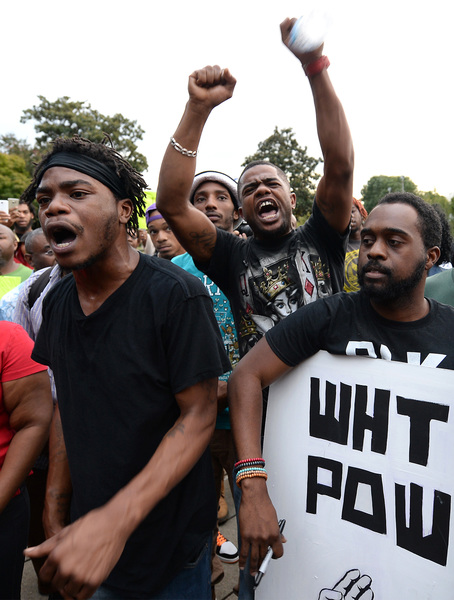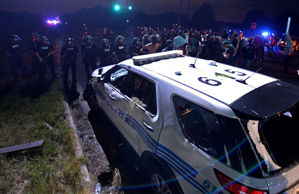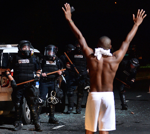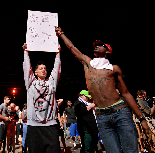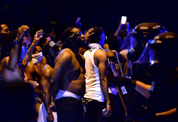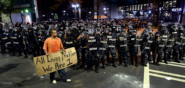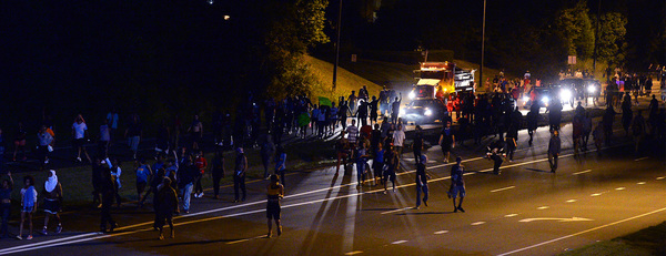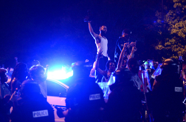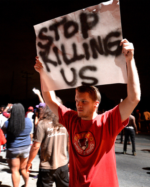 The protesters began to gather as night fell, hours after the shooting. They held signs that said "Stop Killing Us" and "Black Lives Matter," and they chanted "No justice, no peace." The scene was sometimes chaotic and tense, with water bottles and stones chucked at police lines, but many protesters called for peace and implored their fellow demonstrators not to act violently.