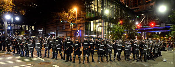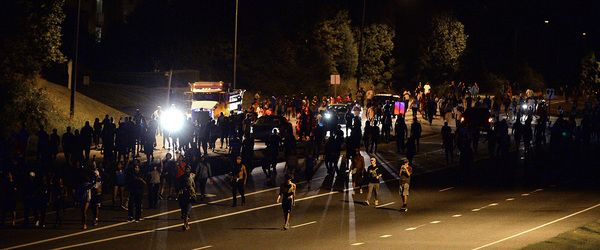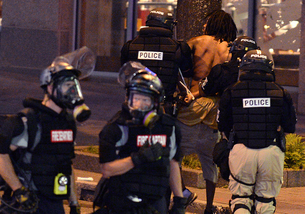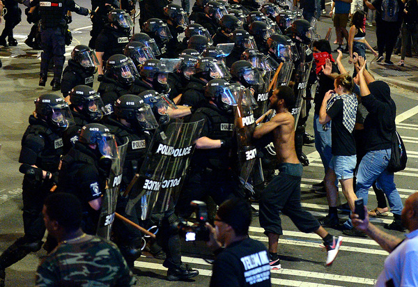 Twelve police officers were injured Tuesday night in a series of clashes, and reports were coming in early Wednesday of motorists on Interstate 85 being hurt and their vehicles damaged when protestors threw rocks, bottles and traffic cones off interstate overpasses onto traffic below.