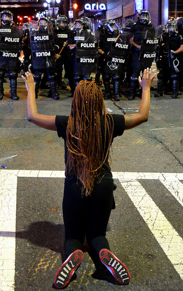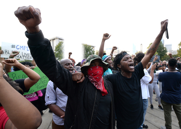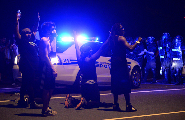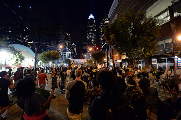Charlotte's Tuesday night protests began on Old Concord Road at Bonnie Lane, where a Charlotte-Mecklenburg police officer fatally shot a man in the parking lot of a University City apartment complex Tuesday afternoon.