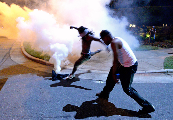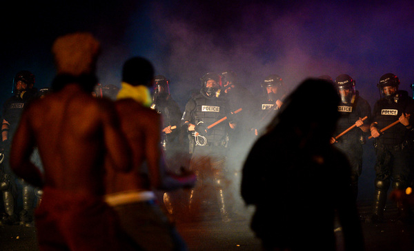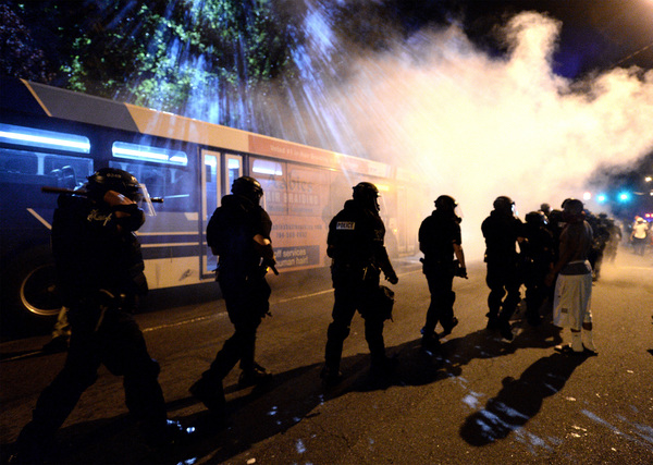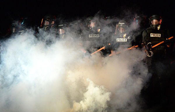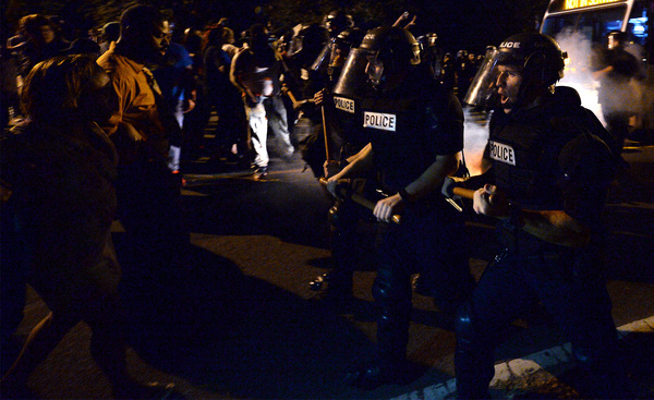 Shortly before 11 p.m., police donned gas masks. Soon, clouds of tear gas bloomed in front of their lines.