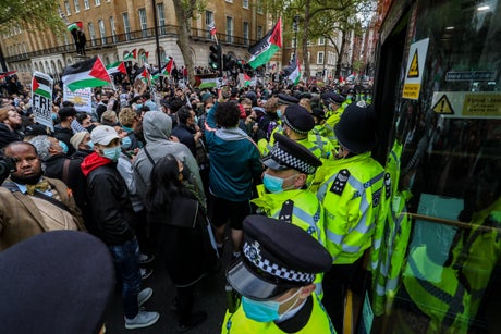 Hundreds of protesters gathered outside Downing Street to call on the British government to take action against the potential forced eviction of Palestinians from the Sheikh Jarrah neighbourhood in Jerusalem, as violence between Hamas and Israel escalates.
