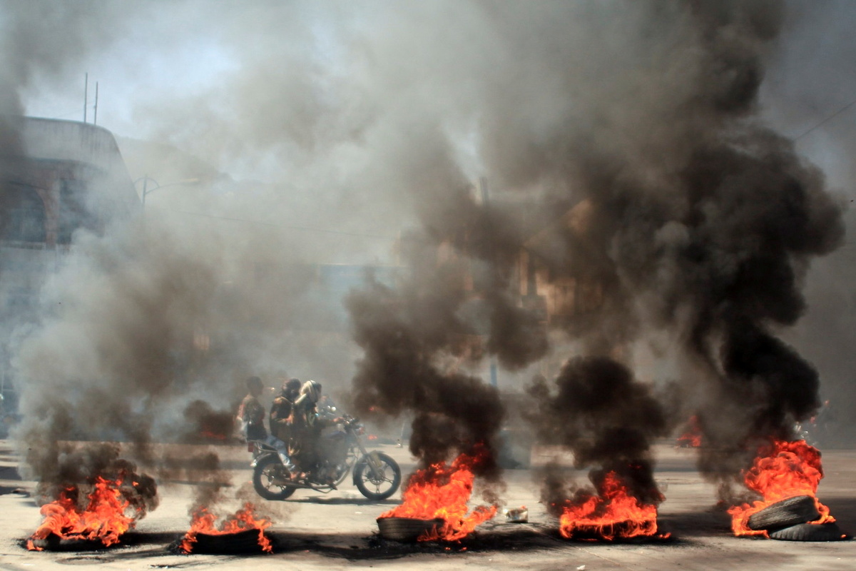 Dozens of people blocked a street and entrances to several districts in the disputed southwestern city with rocks and burning tires, witnesses said, before the crowd swelled to hundreds protesting sharp drops in the currency that has stoked inflation.