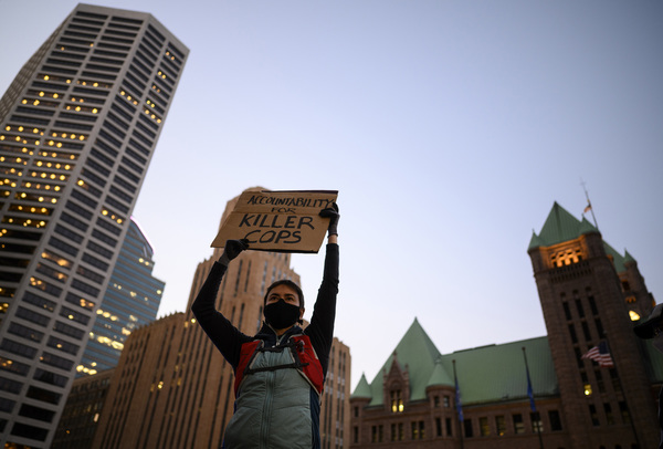 Protesters gather on Thursday, Oct. 8, 2020, outside the Hennepin County Government Center in Minneapolis, a day after the release of former Minneapolis Police Officer Derek Chauvin, charged with the murder of George Floyd. (Aaron Lavinsky/Minneapolis Star Tribune/TNS)