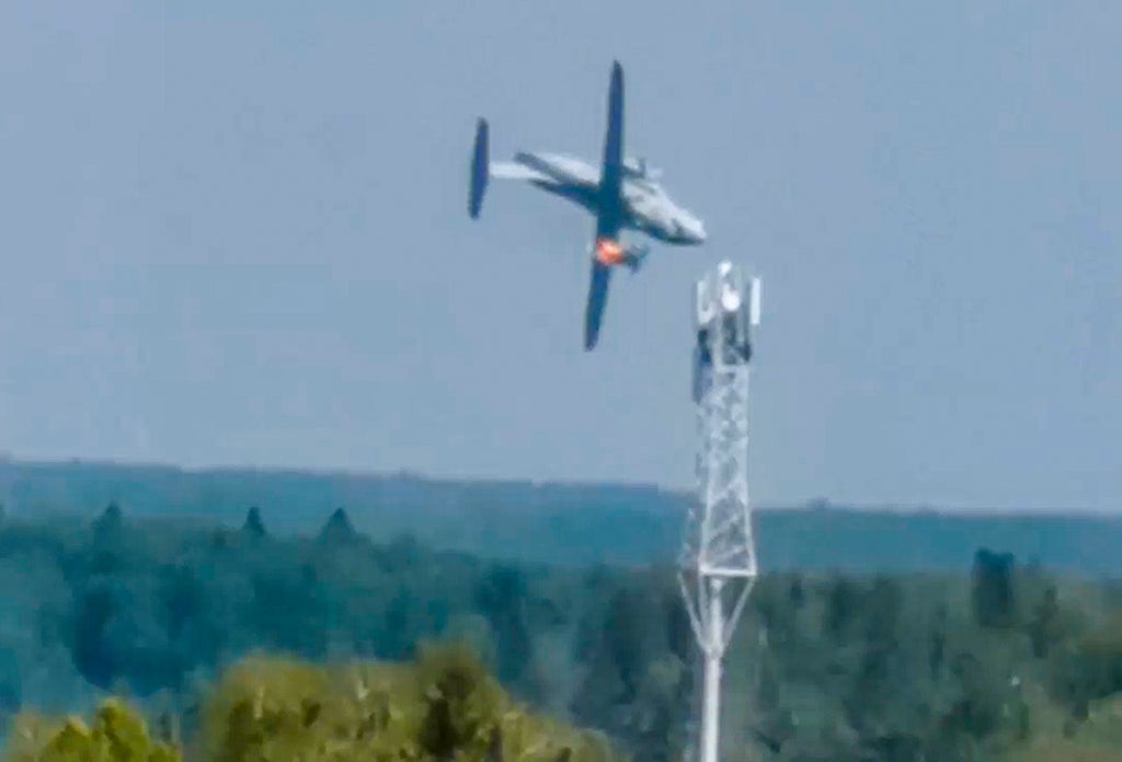 The Baza online news outlet posted a video on its channel in the messaging app Telegram of an airplane crashing into the woods after one of its engines caught fire.